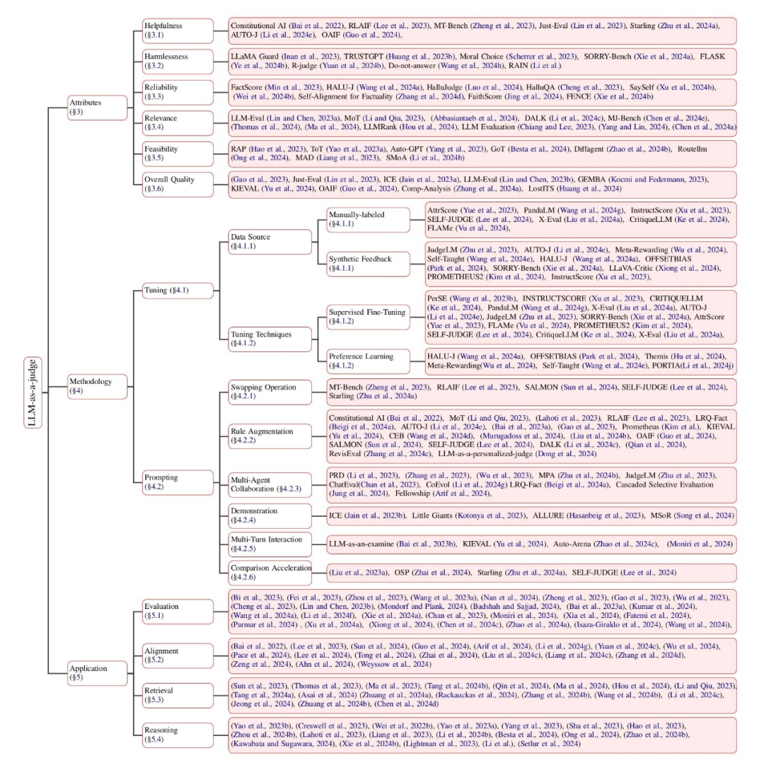 本文探讨了 LLM-as-a-judge 的惊喜微妙之处。我们首先根据输入格式(逐点、成对和列表)和输出格式(包括评分、排名和选择)对现有的基于 LLM-as-a-judge 进行定义。然后,我们提出了一个全面的 LLM-as-a-judge 的分类法,涵盖了判断属性、方法和应用。此后,我们介绍了 LLM-as-a-judge 的详细基准集合,并结合了对当前挑战和未来方向的深思熟虑的分析,旨在为这一新兴领域的未来工作提供更多资源和见解。