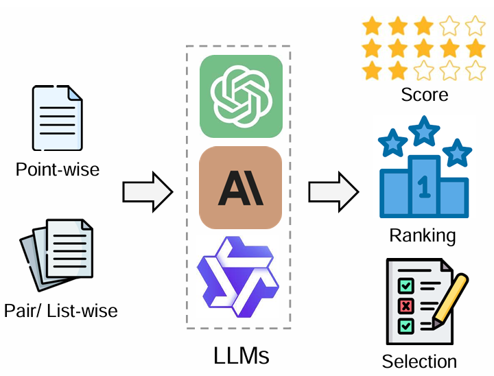 在这篇工作中,我们提出根据输入和输出格式的区别对 LLM-as-a-judge 进行了定义。首先,根据输入候选样本个数的不同,在输入的层面 LLM-as-a-judge 可以分为逐点和成对 / 列表输入;另外,根据模型输出格式的不同,在输出的层面 LLM-as-a-judge 的目的可以分为评分,排序和选择。