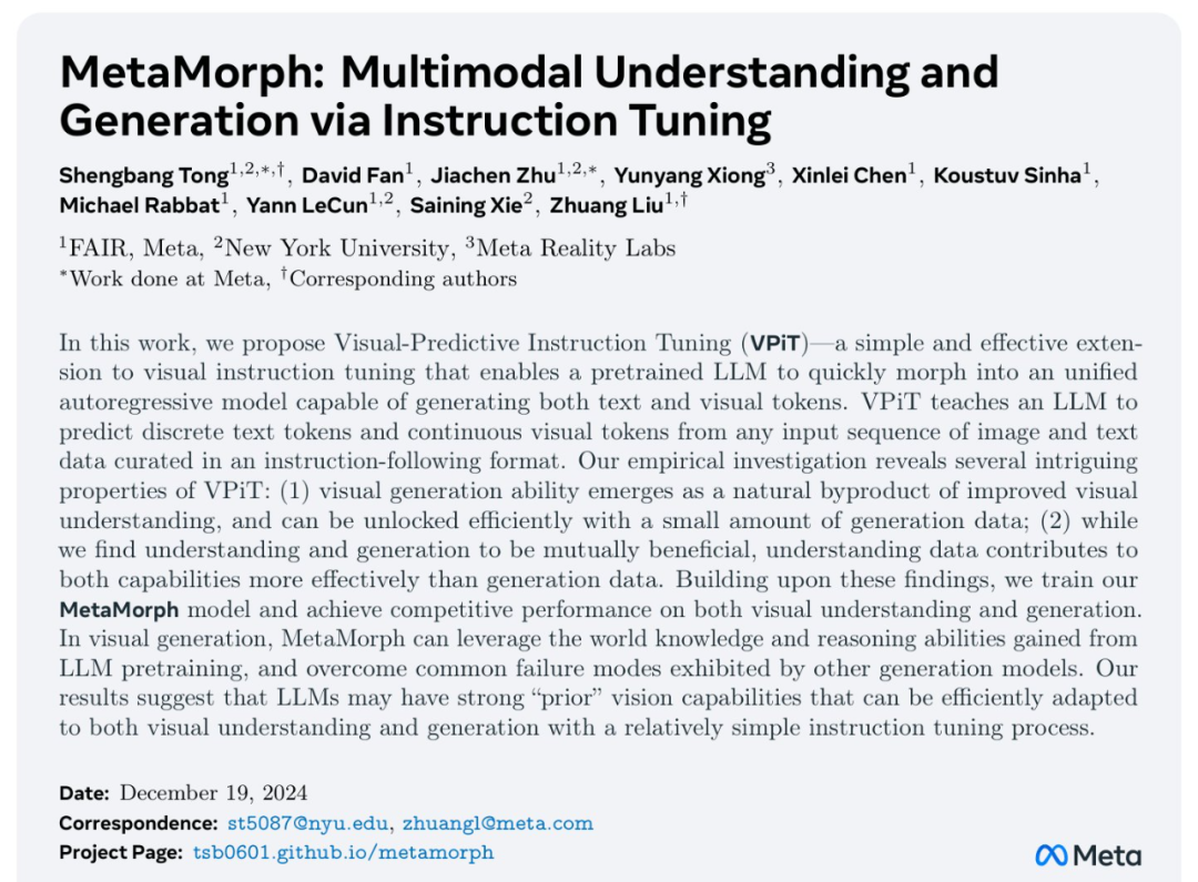 在 Meta 和纽约大学合作的一篇论文中,研究者探究了 LLM 是否也可以通过微调来生成具有同等效率和有效性的视觉信息?论文作者中包括了 AI 领域的几位知名学者,包括图灵奖得主 Yann LeCun、纽约大学计算机科学助理教授谢赛宁、FAIR 研究科学家刘壮(将于明年 9 月加盟普林斯顿大学,担任计算机科学系助理教授)。