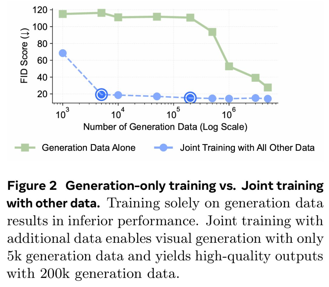在下图 2 中,研究者发现仅对视觉生成进行训练的表现明显差于使用所有其他数据的联合训练。在超过 300 万个图文对的情况下,模型很难生成高质量的视觉图像(∼40 FID 分数),并且性能仍然不如使用 500 万个图文对进行联合训练的情况。这表明仅对视觉生成数据进行训练的样本效率明显较低。
