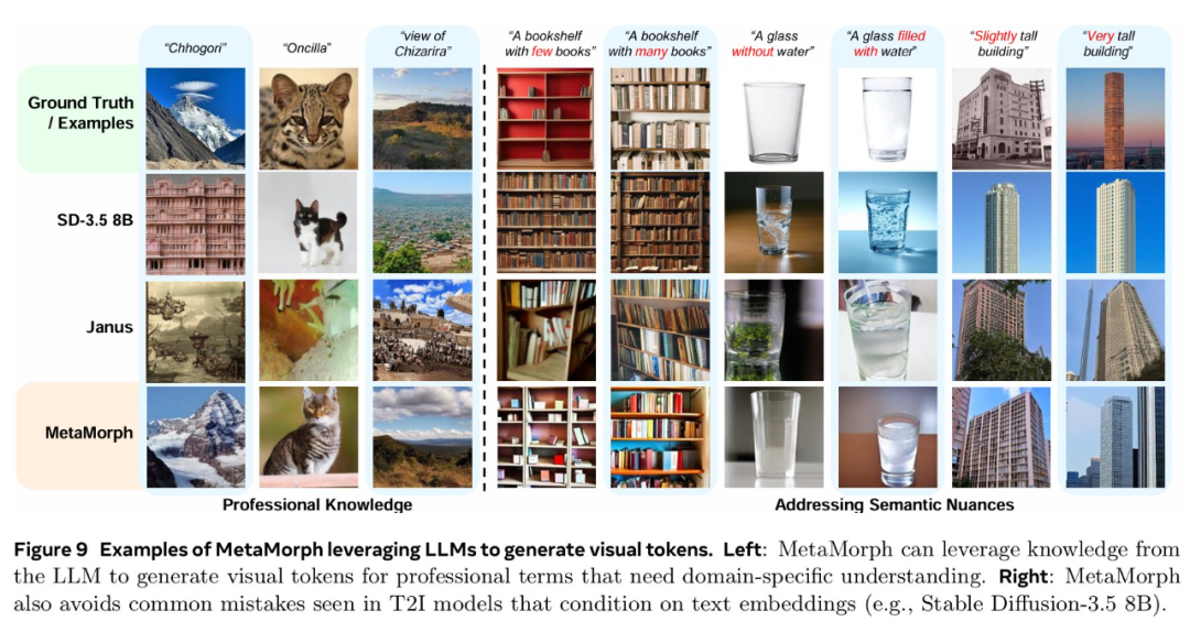 MetaMorph 能有效利用预训练的 LLM 中蕴含的世界知识,图 9 左侧展示了一些例子。研究者去提示模型生成需要非难和专业化知识的概念,例子包括 Chhogori(世界第二高峰)、Oncilla(南美洲的一种小野猫)和 Chizarira(津巴布韦一个与世隔绝的荒野地区)。