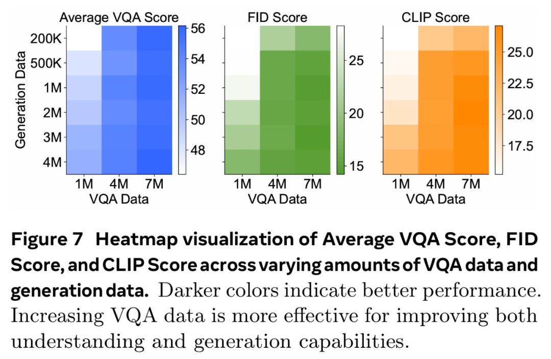 研究者调研了理解与生成数据是否同等重要,他们联合训练了不同规模的 VQA 数据(f1M、4M、7M)和生成数据(200k、500k、1M、2M、3M、4M)。下图 7 总结了这些发现,其中 x 轴表示 VQA 数据,y 轴表示生成数据。结果通过热图可视化,其中较深的颜色代表更好的性能。