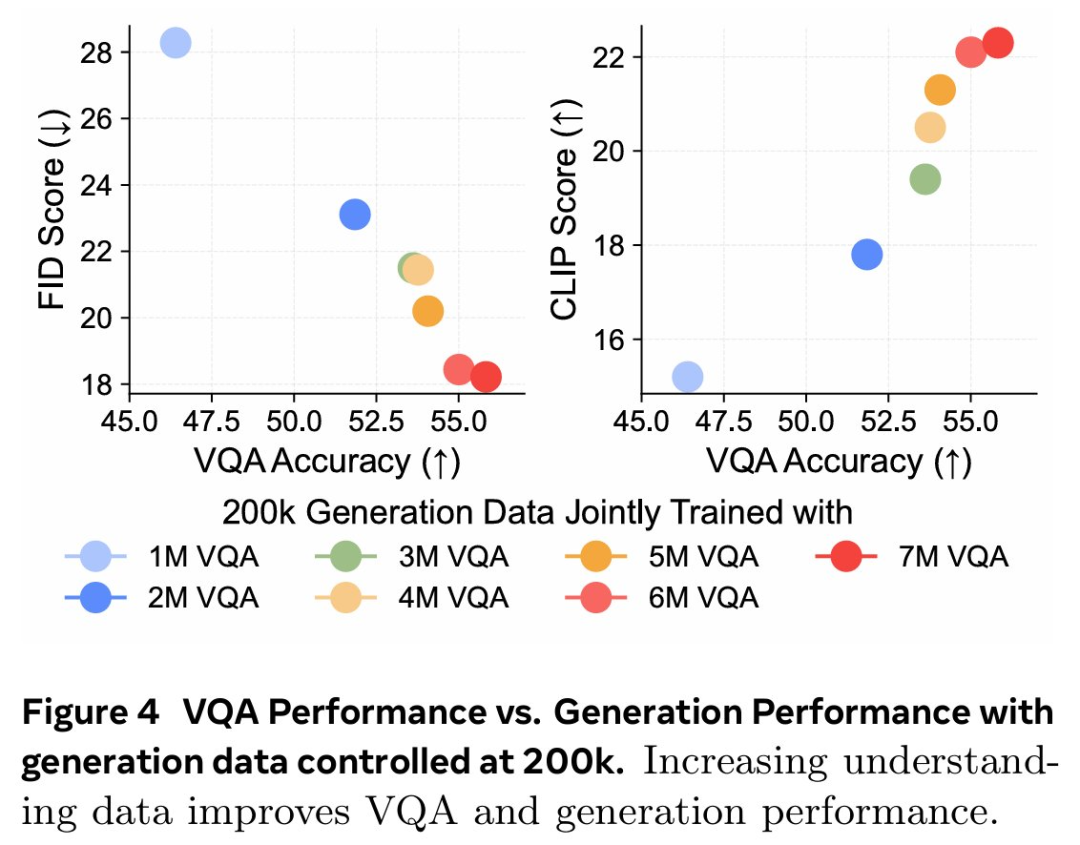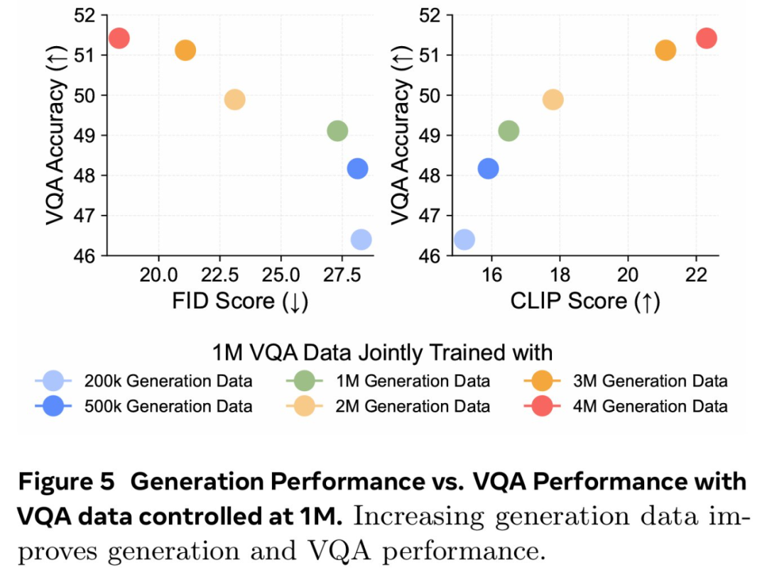 更多的生成数据同样可以带来更好的理解和生成性能。研究者探索了视觉生成能力的提高是否也与更高的 VQA 性能有关,为此他们使用固定的 1M VQA 样本作为理解基线进行了一项对照实验。然后改变生成数据的数量({200k、500k、1M、2M、3M、4M})以调整生成能力,同时与固定的 1M VQA 数据进行联合训练。下图 5 的结果显示,在 1M VQA 设置中,更强的生成能力与 VQA 性能的提升相关。这意味着增加生成数据量不仅可以增强生成能力,而且还会对 VQA 性能产生积极影响。