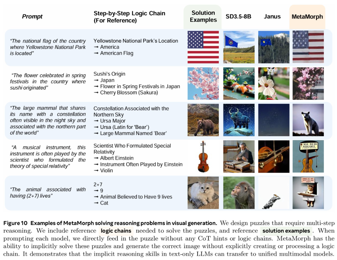 图 10 中,研究者展示了模型根据谜题提示生成图像的例子,例如「国家公园位于」。在每道谜题中,都直接使用了「黄石公园所在国家的国家公园」这一提示语,而没有使用任何思维链(CoT)提示语「生成谜题图片」。MetaMorph 可以从需要多步推理的提示中生成正确的图像。