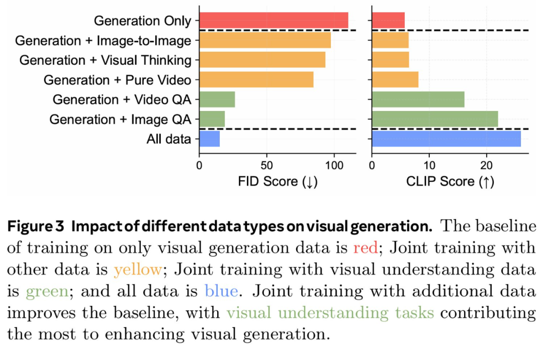 发现 3:虽然增加数据可以提升整体性能,但视觉理解数据的影响明显高于视觉生成数据的影响。