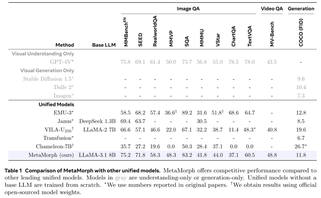 研究者将 MetaMorph 与其他统一模型进行了比较,并在表 1 中总结了结果。