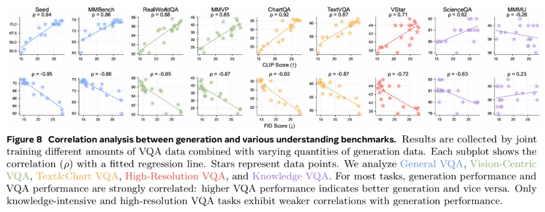 图 8 显示,通用、视觉中心和文本与图表 VQA 任务与生成性能密切相关,每个任务的皮尔逊相关系数(p)都高于 0.85。高分辨率 VQA 表现出中等程度的相关性,p 约为 0.7。相比之下,知识 VQA 任务(如 MMMU)的相关性较弱,这表明生成能力与生成性能的相关性更为密切。这与模型的视觉能力有关,而与知识特定任务无关。