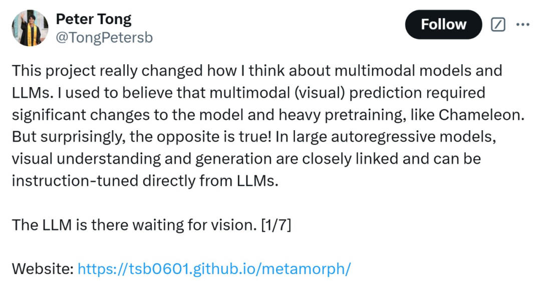 作者之一 Peter Tong 表示:「这个项目确实改变了我对多模态模型和 LLM 的看法。我过去认为多模态(视觉)预测需要对模型进行重大更改和大量预训练,例如 Chameleon。但令人惊讶的是,事实恰恰相反!在大型自回归模型中,视觉理解和生成紧密相关,可以直接从 LLM 进行指令调整。」