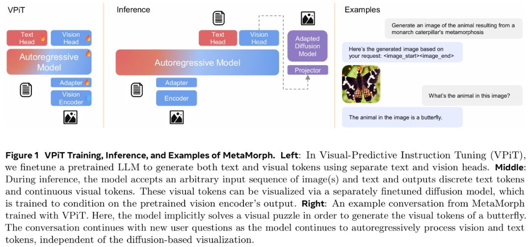 在本文中,研究者提出了视觉预测指令调整(Visual-Predictive Instruction Tuning,VPiT),它是视觉指令调整的简单扩展,建立在将连续视觉 token 作为输入传递给 LLM 的现有范式之上。VPiT 训练 LLM 以在微调阶段输出连续视觉 token 和离散文本 token。该模型以预训练的视觉编码器嵌入以及文本 token 作为输入,并输出文本 token 和连续视觉 token 的组合。