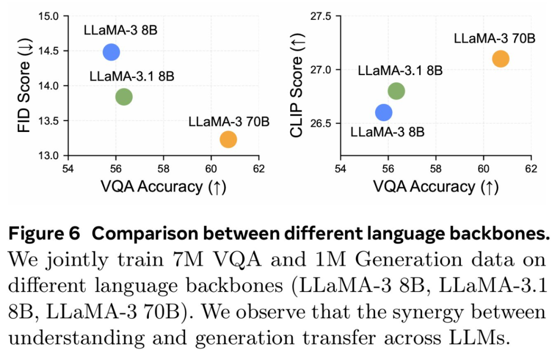 这种协同作用可以扩展到不同的 LLM。研究者探究研究结果是否可以迁移到不同的 LLM 主干。通过使用 7M VQA 样本和 1M 生成数据的组合,他们在 LLaMA-3 8B、LLaMA-3.1 8B 和 LLaMA-3 70B 上训练 VPiT。下图 6 显示了不同 LLM 之间的扩展行为。