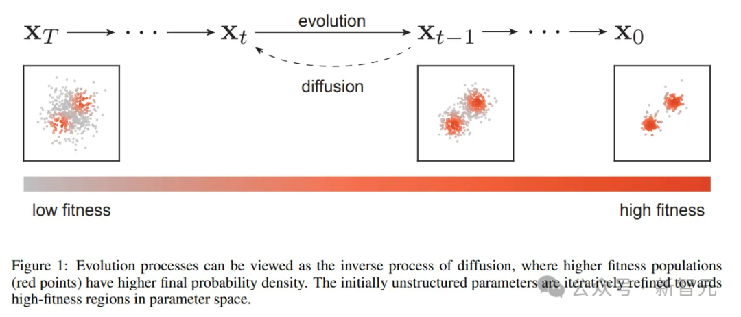 由此可知,扩散模型和进化算法都涉及迭代数据更新和从复杂分布中对新对象进行采样,两者都是定向更新和随机扰动的组合。