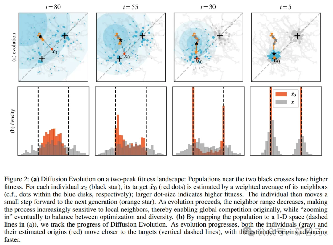 1)从一组随机解开始(如扩散模型中的噪声); 2)在每个步骤中,每个解决方案都由一个适应度函数评估,对每个解决方案进行「去噪」(与相邻解决方案加权平均来估计),并向前迈出一小步,同时加入一个小的随机突变; 3)逐渐减小相邻搜索半径(首先全局探索解决方案空间,然后在本地进行优化)