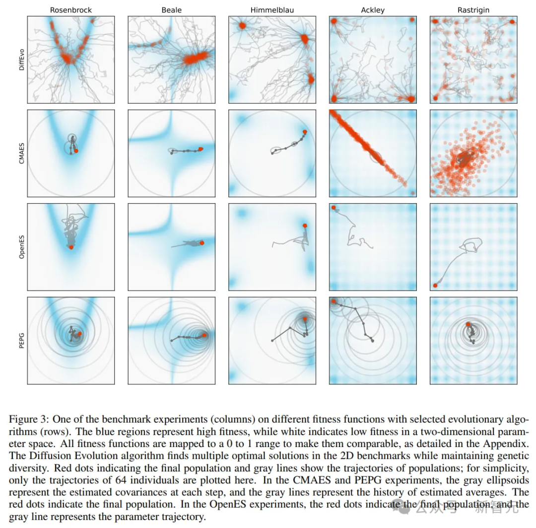研究人员在多个二维优化场景中进行了实验(Rosenbrock和Beale有一个最优值,Himmelblau、Ackley和Rastrigin有多个最优值),并与其他进化算法(CMA-ES、OpenES和PEPG)做出比较。