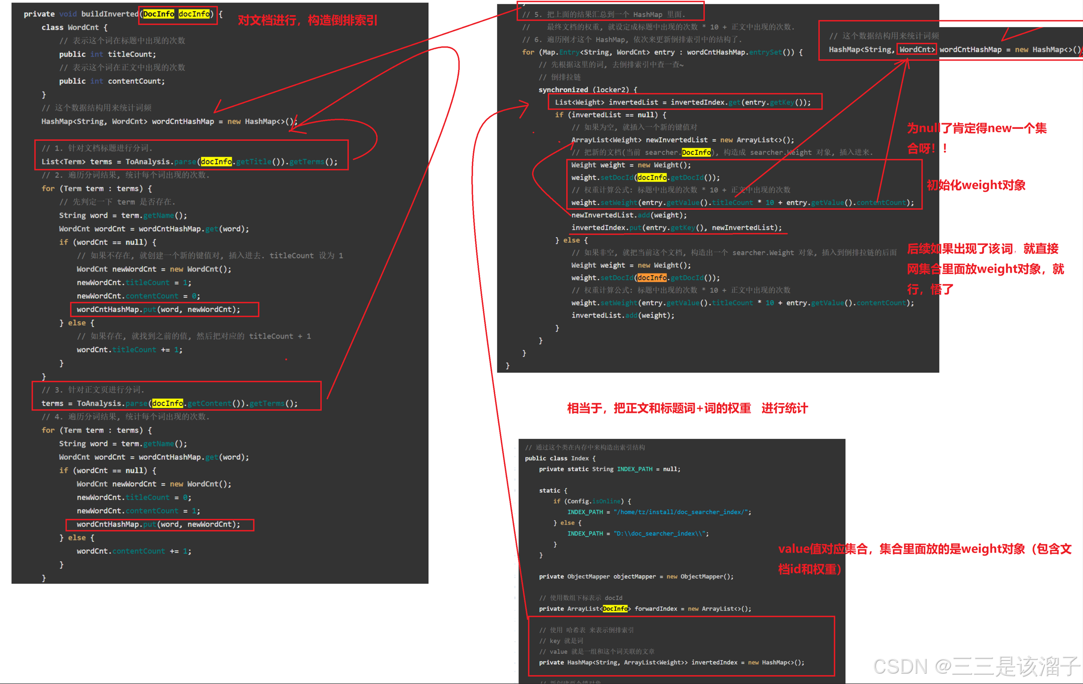 }实现buildInverted方法,这里逻辑是不是看着就头大,(大家结合代码和注释看会更清晰)待我慢慢分析