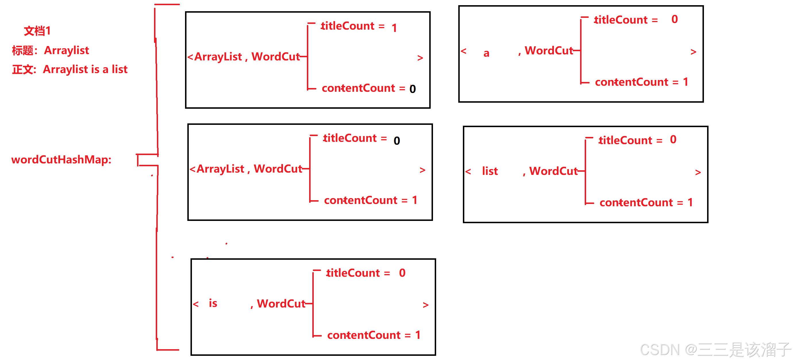 //使用哈希表来表示倒排索引,key是词,value是一组跟这个词相关联的文章(倒排索引)