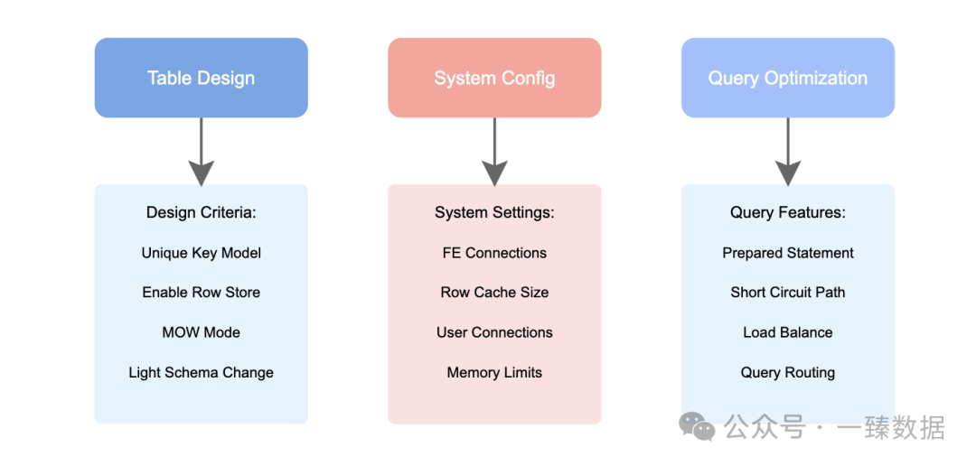 小张在实施Doris高并发点查优化时,首先升级到Doris最新的Release稳定版本,接着需要从表设计、参数配置和查询优化三个层面入手: