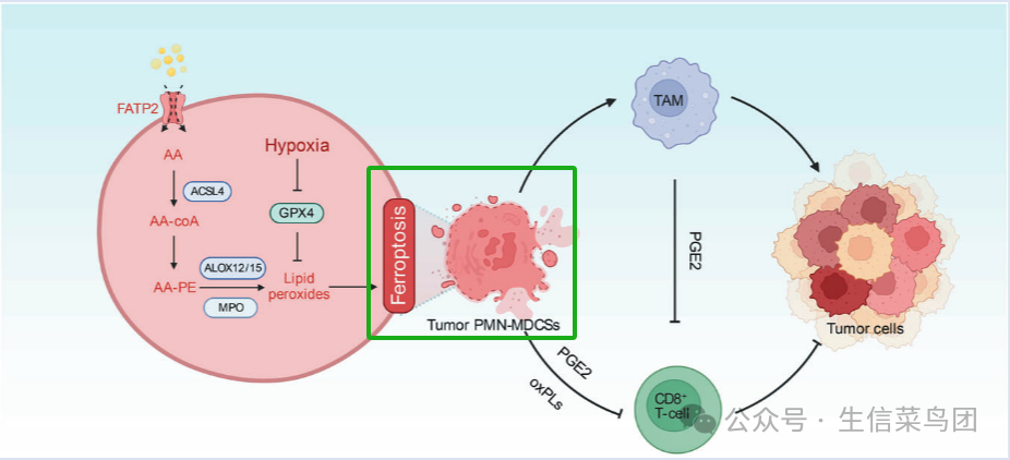 铁死亡是一种由铁催化的脂质过氧化引起的程序性细胞死亡方式。在肿瘤微环境中,铁死亡既可以作为抗肿瘤机制(通过诱导肿瘤细胞死亡),也可能通过影响免疫细胞(如中性粒细胞)的活性而促进肿瘤进展。