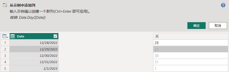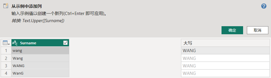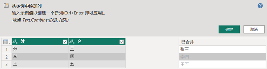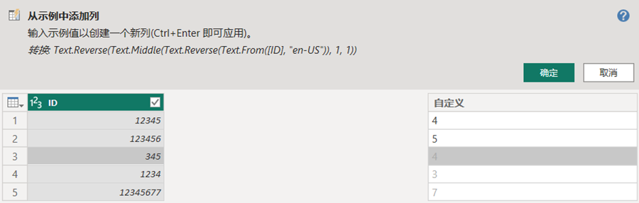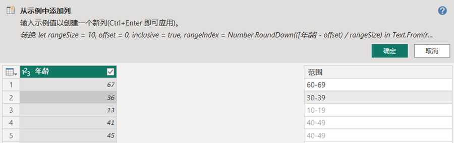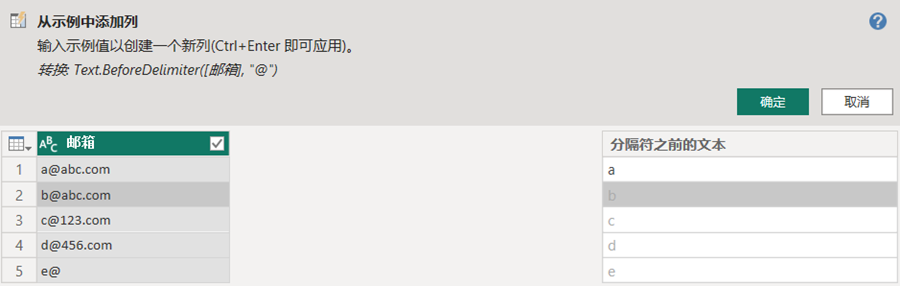 如果对PowerQuery的M语言还不熟悉,添加列的时候可以先尝试按示例添加列;即便已经很熟悉M语言了,也可以偷个懒,用按示例添加列可以省去敲繁琐的代码。不写代码,输入示例,让计算机理解你的意思,跟你确认,确认的话,点个确定就大功告成了。微软硬生生地翻译为“示例中的列”,实际上翻译成“按示例添加列”更恰当。
