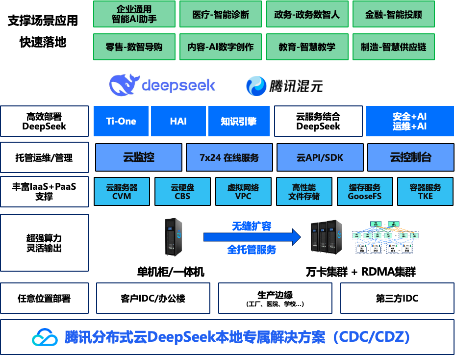 为解决客户从算力、安全,到企业级应用构建的困难,提供一站式全栈解决方案,腾讯分布式云团队基于分布式云矩阵 本地专用集群(CDC)、专属可用区(CDZ)以及丰富上层云产品,构建了面向企业本地化部署的DeepSeek专属解决方案。
