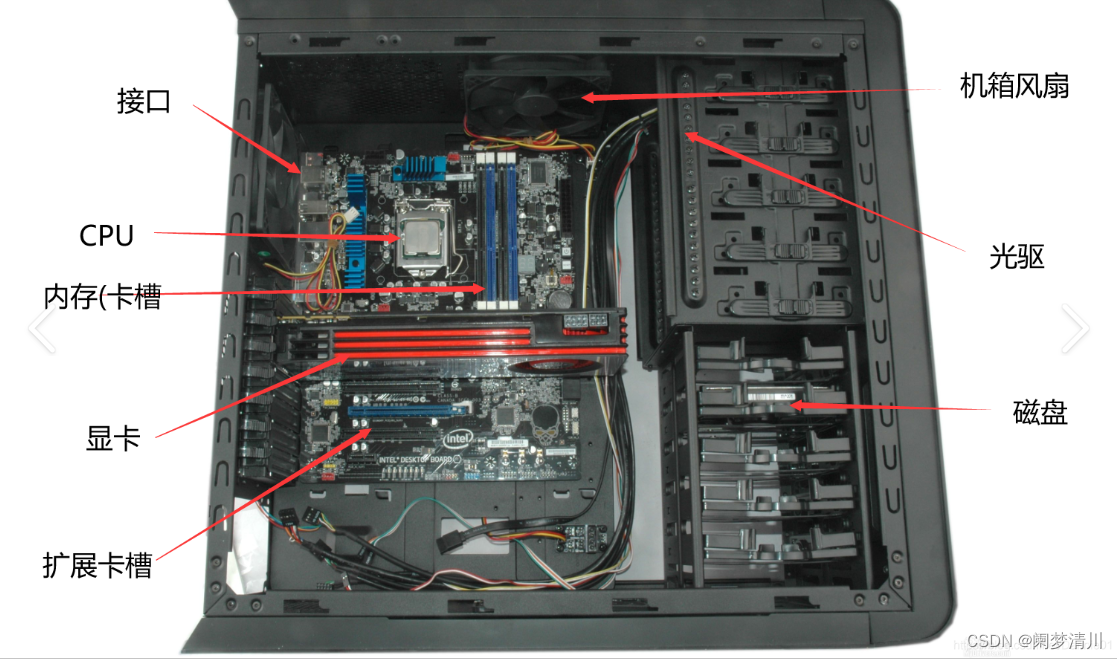 (2)下面的这个就是这个计算机的机箱的简单结构图展示,这个上面没有展示的就是我们的显卡和这个显示器。其他的都写了出来,这个上面显示的光驱现在是不怎么常用的,其他的还行,台式机的结构基本上都是差不多的;