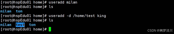 这个就是需要我们加上这个相关的选项,这个加的是-d 、/home/test king表示的就是添加上这个king用户到这个家目录的test下面,但是这个文件的名字叫做test,就是说我们添加的这个用户不是家目录里面的这个对应文件的名字,而是我们自己去自定义名字;