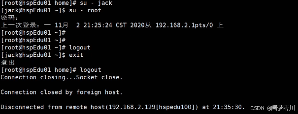 logout就是返回之前的这个用户,或者是exit命令,例如我们从这个root切换到jack,我们在这个jack下面的时候,使用exit和logout就会返回这个root用户;