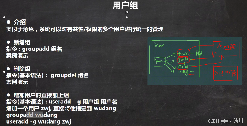 但是一般为了方便我们对于用户进行管理,我们会把这个创建的用户放到我们制定的这个组里面去,使用下面的这个user -g 组名 用户名。这个组名就是我们想要自己设置的组名,用户就是我们想要添加的用户;