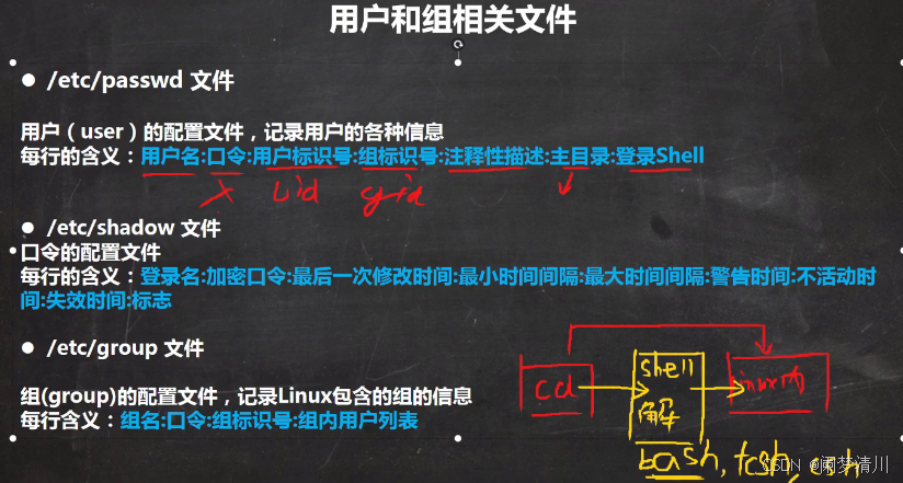 这个etc/passwd目录下面文件就是和我们的用户相关的配置文件,每一行最后有一个hsell,这个其实就是我们的指令和linux内核之间的一个类似于解释器一样的东西;