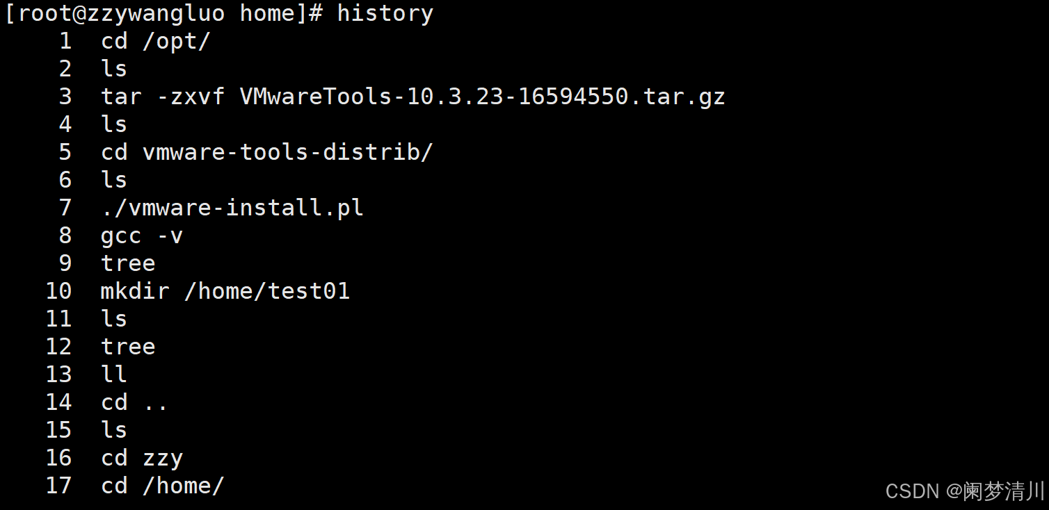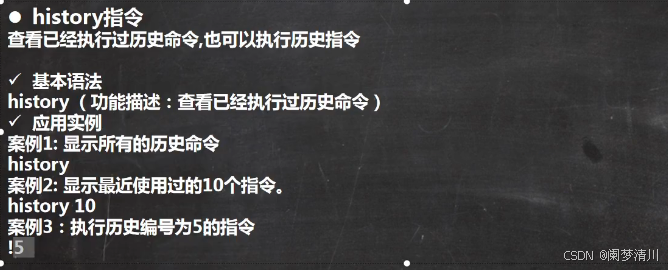这个时候打印的结果就是我们之前使用过的所有的指令,我们有的指令比较长,如果我们想要重新执行这个指令,但是不想输入,我们可以使用感叹号加上这个指令的序号,就可以再次执行这个指令了;