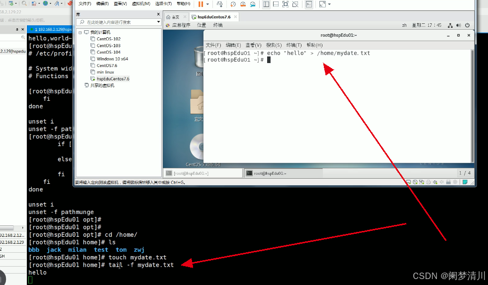 实际上应该是先输入这个tail这个时候就会等待我们进行更新,然后我们打开这个虚拟机的终端,使用echo向这个文件里面写入内容,这个同时就会在我们的xshell显示出来,这个就是实时追踪的效果;