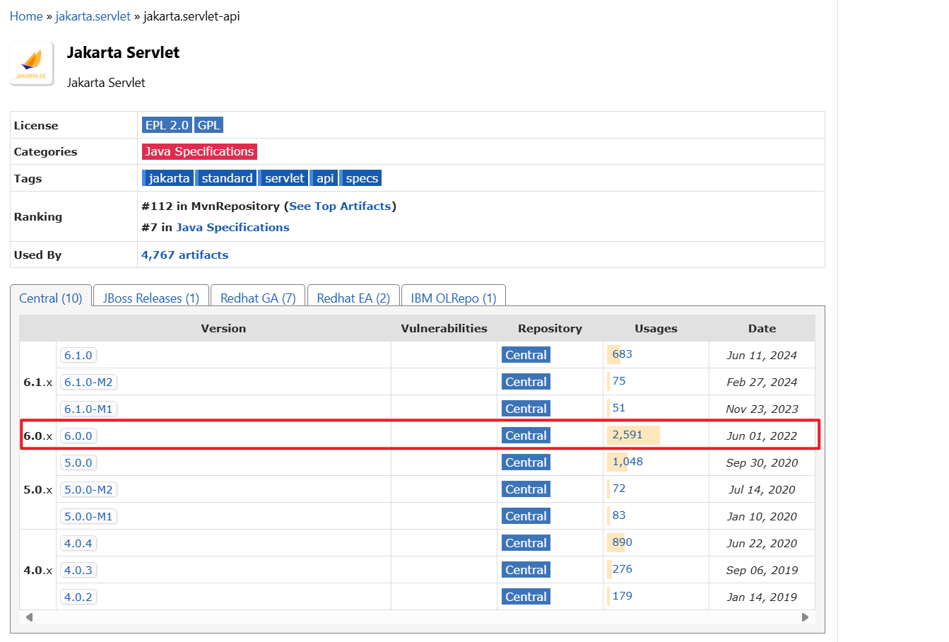 下面的这个第一个是我们的这个标准库,我们先去这个里面找我们的这个servlet的版本,如果找不到,例如我的这个tomcat就是10.0版本的,所以需要的这个servlet就是6.0,这个版本就是在下面的这个第三个里面,这个里面的这个版本可能会新一些;