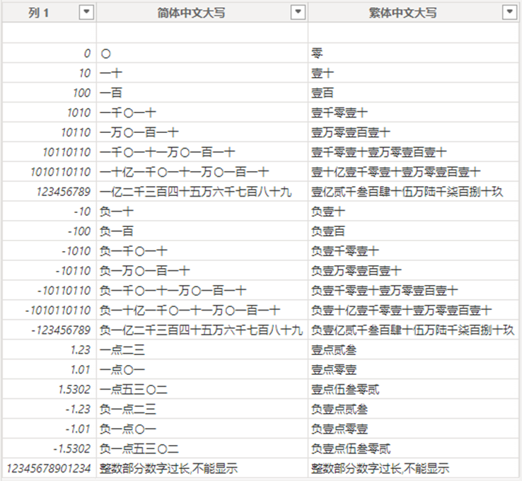 以计算列为例,新建列后,将上述代码中的m=[列1],简体中文大写和繁体中文大写返回的结果如下: