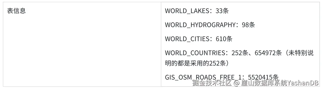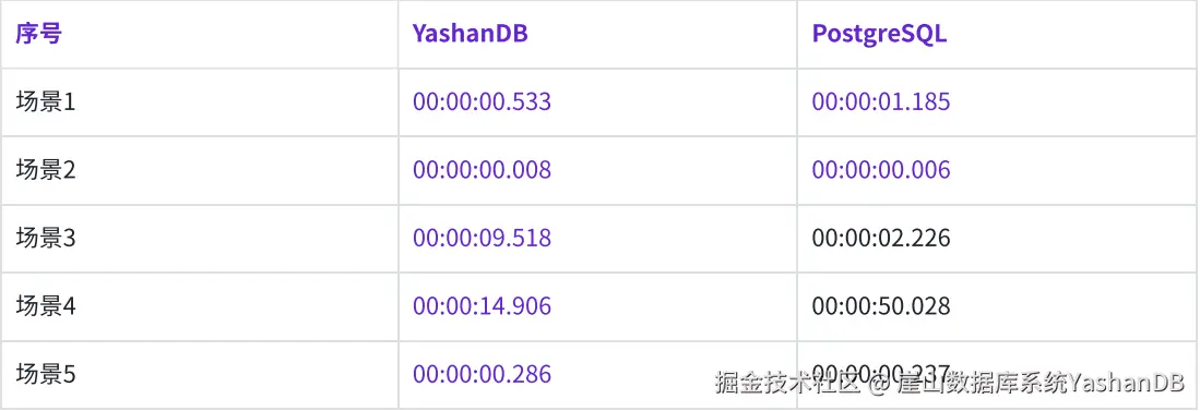 整体的测试数据优于PostgreSQL,特别是创建R-tree索引的速度,个别场景⽐如数据来源于表,YashanDB没有对表数据的缓存,相对PostgreSQL会慢⼀点。 汇总数据,采⽤的是三次执⾏结果的平均值,采用四舍五入