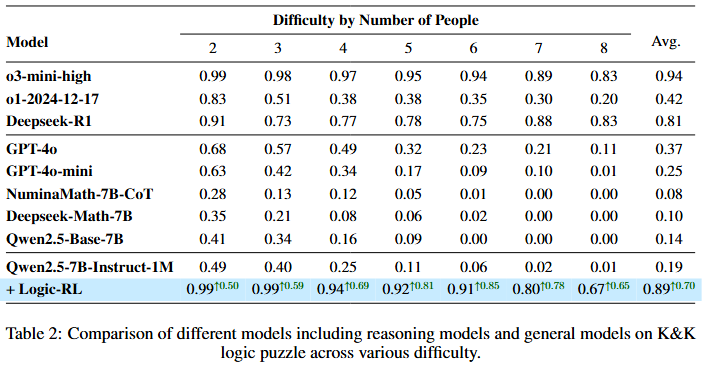 在经过 5K 个逻辑问题的训练后,7B 模型就发展出了一些在逻辑语料库中原本不存在的高级推理技能 —— 如自我反思、验证和总结能力。在没见过的数学竞赛题 (AIME/AMC)上,各自取得了 125% 和 38% 的性能提升。