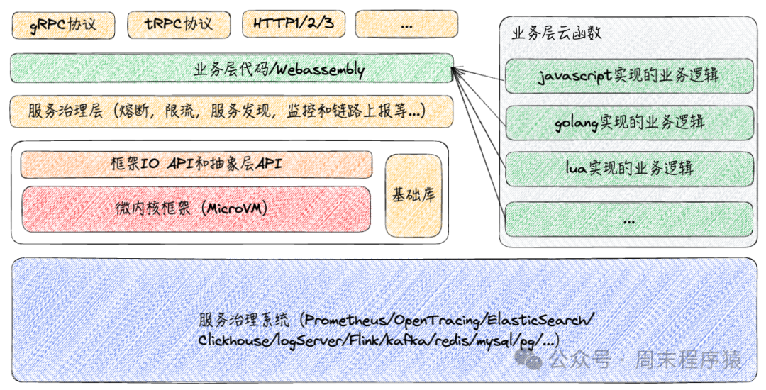 其实参考AWS Lambda的技术路径也是如此,他们正在尝试轻量化容器和microVM去解决慢启动问题,而我们使用微内核解决业务边界和安全问题,因为场景的是可以枚举的,不需要做到足够非常通用化,于是形成如下架构: