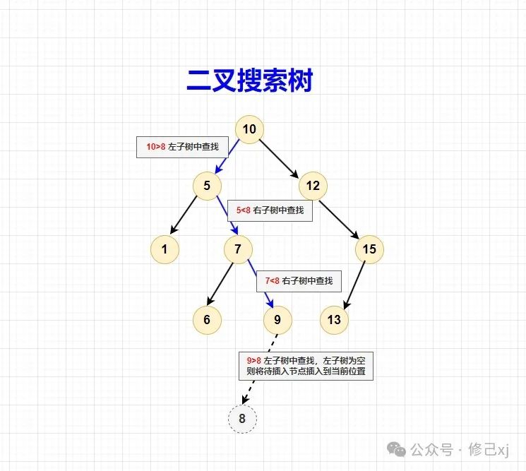 二叉树中进行插入元素操作时,只需要找到插入元素的父节点,插入到对应的位置即可;步骤如下: