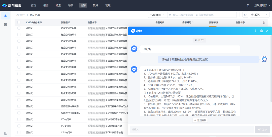 作为企业运维团队的得力助手,小鲸观测助手结合内置运维知识库与业界领先的大模型技术,集成对接 DeepSeek、ChatGPT、通义千问等大模型,不仅可以协助处理日常运维难题,还能够帮助团队在告警治理过程中减轻负担。以下是小鲸观测助手在企业告警全生命周期管理中覆盖的核心业务场景: