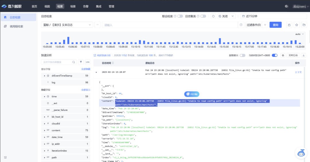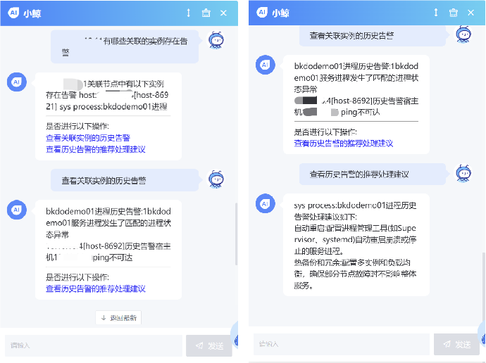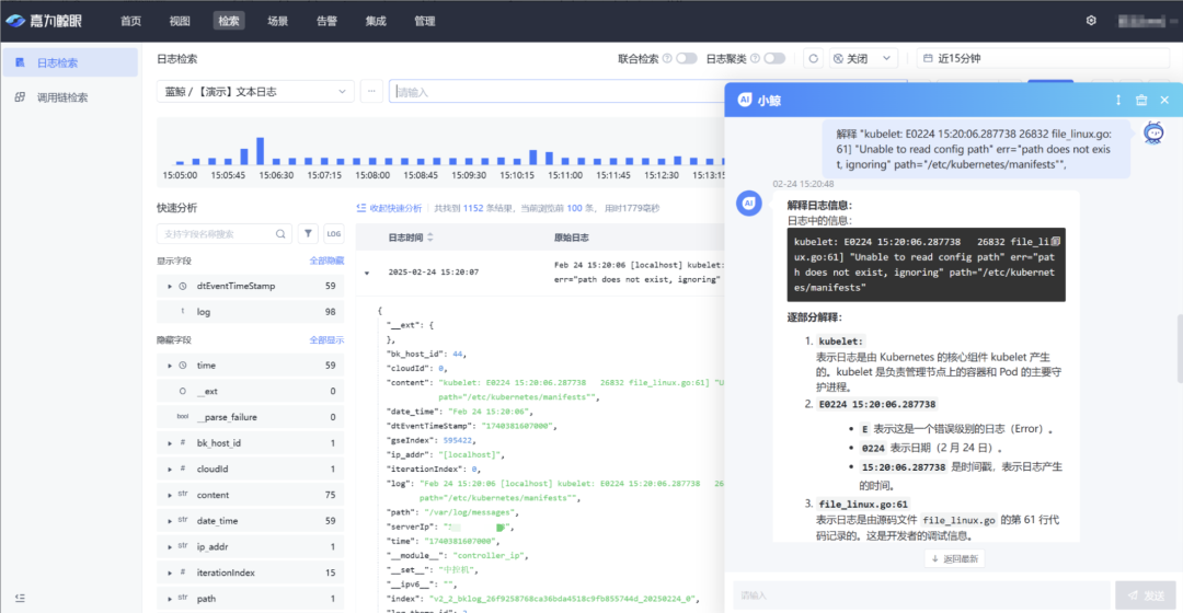 在日常运维工作中,您在页面就能随时唤醒小鲸观测助手,与小鲸观测助手进行互动交流。当您在故障排查过程中,遇到看不懂的错误日志时,可利用“划词问答功能”选中日志中的关键内容向小鲸观测助手提问。小鲸观测助手即时提供专业解答,大幅提升故障排查效率。