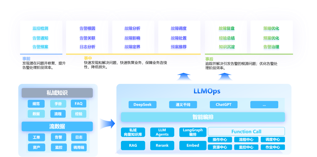 近几年,随着生成式AI技术的突破性发展,从ChatGPT展现的通用智能到DeepSeek的火爆,无疑都彰显出大模型在企业IT运维中的巨大潜力。通过将大模型与企业告警治理的深度应用,构建基于自然语言交互的告警分析、告警处理、根因定位等能力,助力运维模式从“人工经验驱动”向“AI主动治理”升级。