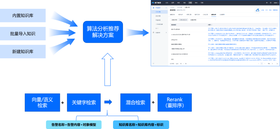 当告警产生后,小鲸观测助手依托告警中心的辅助分析能力,解析告警对象、告警名称、告警内容等关键信息。借助大模型、内置运维知识库、RAG技术,推荐告警产生的原因及可能的解决方案。不仅如此,它还支持混合检索,通过灵活调整向量检索和文本检索的权重,提高知识推荐的准确率。