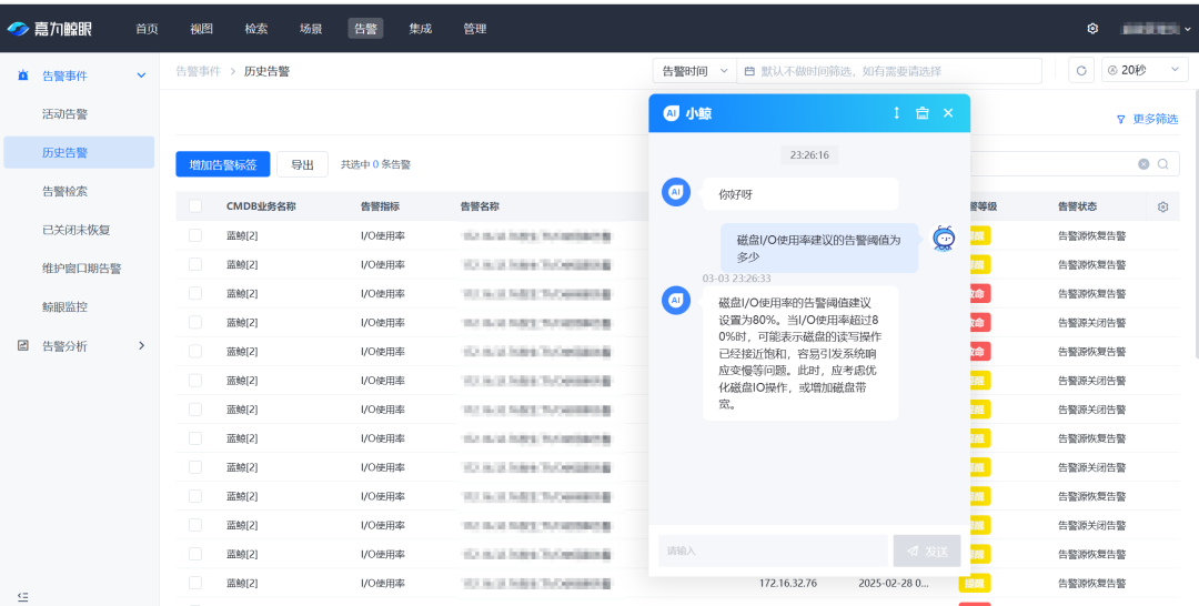 在告警治理过程中,面对高频告警、误报以及漏报等难题。小鲸观测助手可对各类告警事件展开分析。以磁盘 I/O 使用率告警这一高频出现的告警为例,能够快速识别出告警数量过多的问题和产生原因,并依托内置的运维知识库的经验,给出告警阈值配置的最佳实践以及相关优化建议。