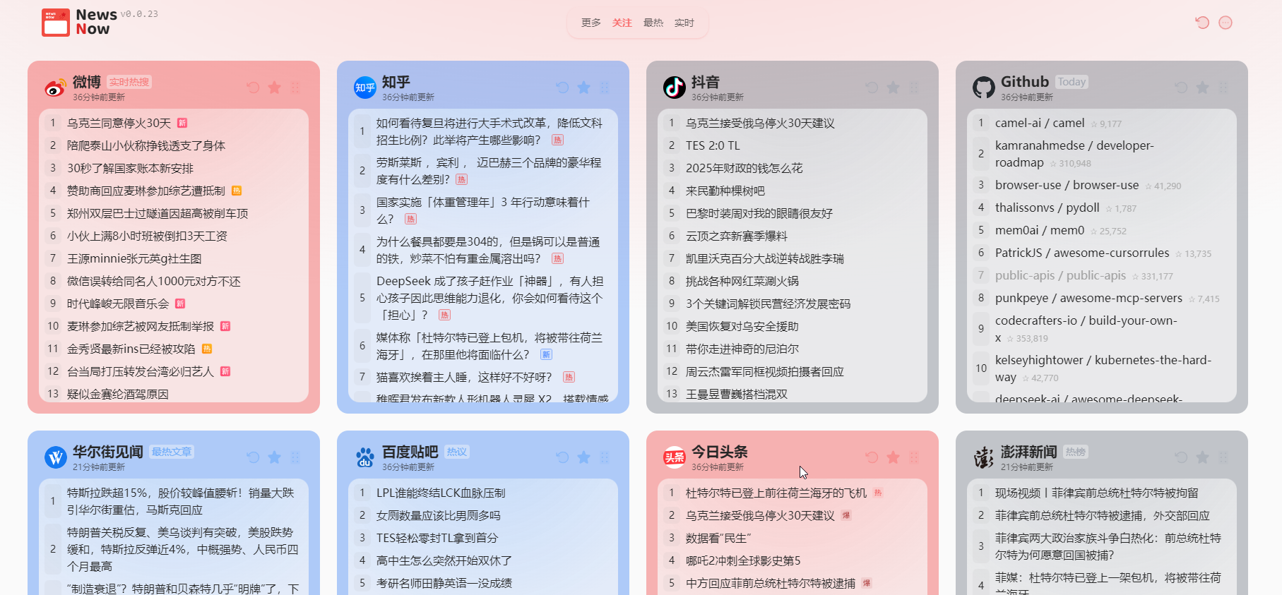 大家上班第一件事都做些什么呢?有没有和我一样,习惯先打开知乎、百度热搜、微博等新闻平台,浏览一下当天的头条新闻?每天都要逐个点开这些网站,再挑选感兴趣的新闻深入阅读,确实有些繁琐。今天在浏览GitHub时,我发现了一个名为NewsNow的项目,这是一款能够优雅地阅读实时热门新闻的聚合平台。接下来,我将为大家详细介绍这个项目,并分享如何进行私有化部署。