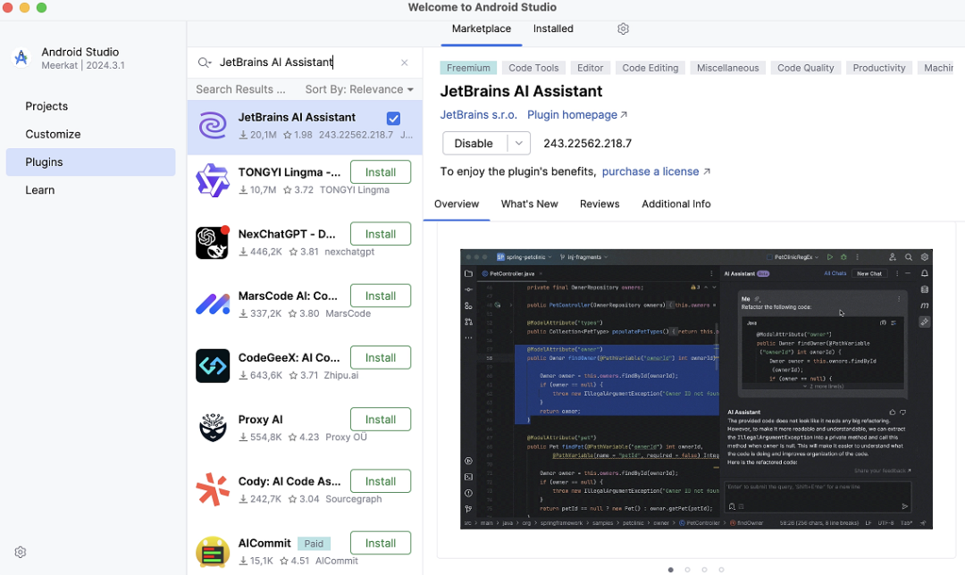 要在 Android Studio 中启用 AI Assistant,请打开 Android Studio Meerkat 2024.3.1,导航到 Plugins,搜索 JetBrains AI Assistant,然后安装插件。
