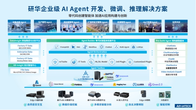 在此背景下,DeepSeek的出现为AI算力的普及提供了新的可能性。要让DeepSeek真正适应工业场景,不仅需要算法的适配,还需要硬件部署的全面优化。研华基于全栈式Edge AI解决方案,通过WISE-AI Agent智能体平台,提供企业级大模型推理与应用方案,让DeepSeek等大模型高效适配工业环境,实现从智能感知到自主决策的AI闭环,助力企业快速智能化升级。