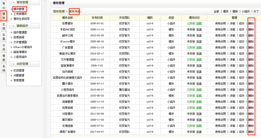 这里除了“广告管理”模块、网站没安装使用的,其他都可以删掉。在后台可以先卸载再删除。