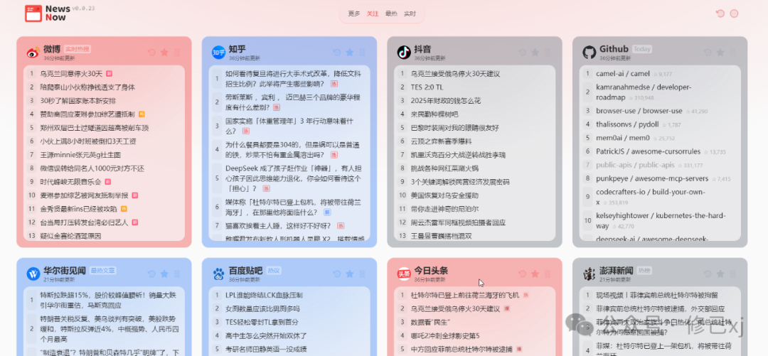 大家上班第一件事都做些什么呢?有没有和我一样,习惯先打开知乎、百度热搜、微博等新闻平台,浏览一下当天的头条新闻?每天都要逐个点开这些网站,再挑选感兴趣的新闻深入阅读,确实有些繁琐。今天在浏览GitHub时,我发现了一个名为NewsNow的项目,这是一款能够优雅地阅读实时热门新闻的聚合平台。接下来,我将为大家详细介绍这个项目,并分享如何进行私有化部署。