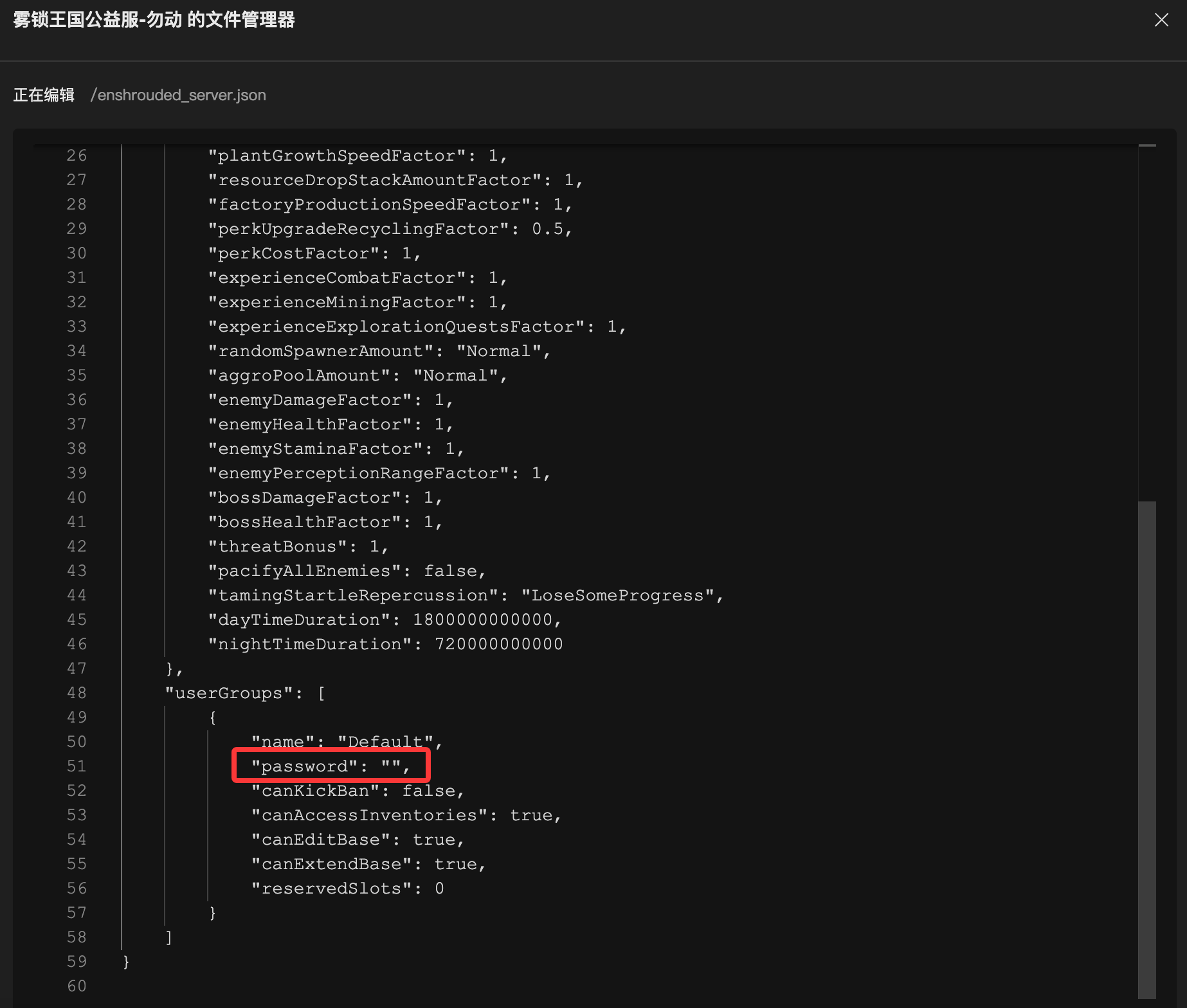 2、编辑 enshrouded_server.json 文件,此处输入房间密码