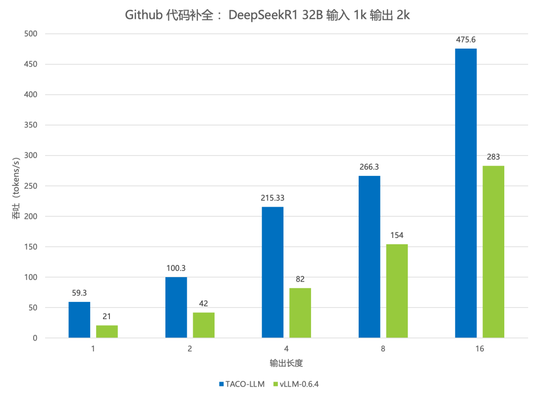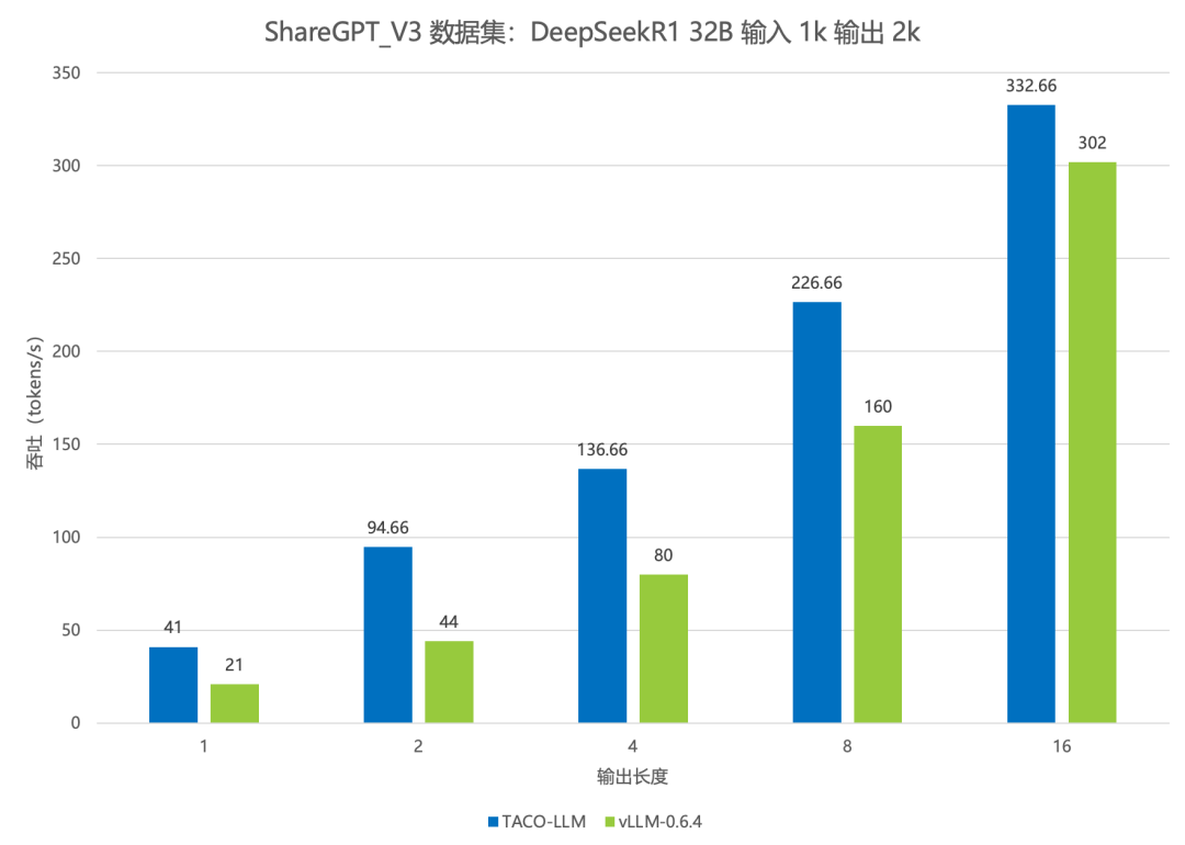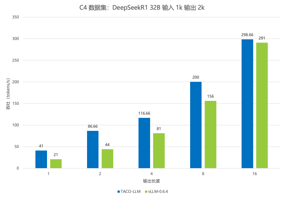 DeepSeek-R1 32B TACO加速版环境,相比于vLLM,可在多个场景提升token吞吐能力,降低生成结果的等待时间,推理流程全面提效。