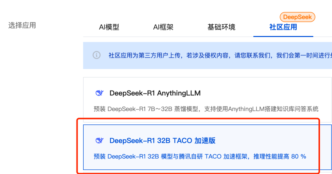 申请成功后,进入高性能应用服务HAI购买页,选中DeepSeek-R1 32B TACO 加速版环境,选择算力套餐进行创建。