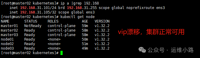这里我们关闭了master01节点,这个时候显示master01已经是NotReady,VIP也飘逸到了master02节点。并且集群也可以正常使用。